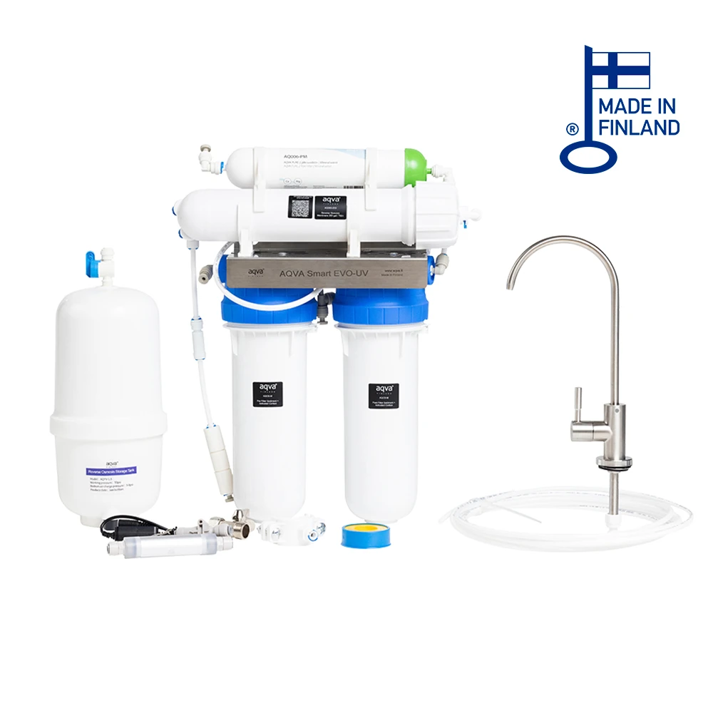 The AQVA Smart EVO UV reverse osmosis device, with the lowest operating costs and the most compact design, is ideal for purifying lake, well, and municipal water for home and cabin use. Designed, developed, and manufactured in Finland.